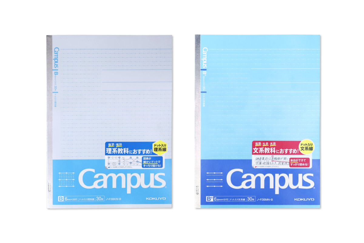 その中でも特に注目なのが、理系科目に最適化された「キャンパスノート(ドット入り理系線)」と、文系科目に便利な「キャンパスノート(ドット入り文系線)」である。