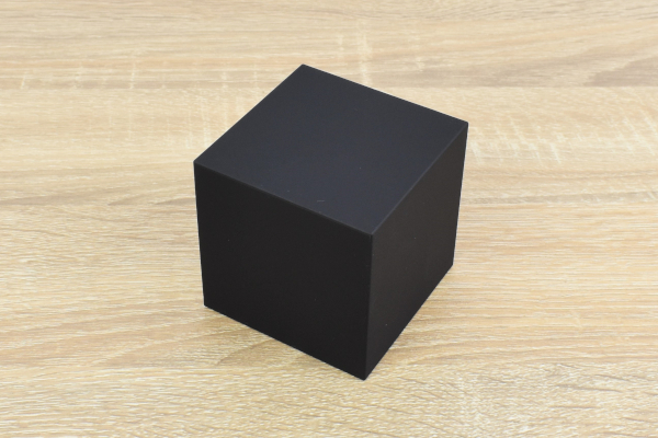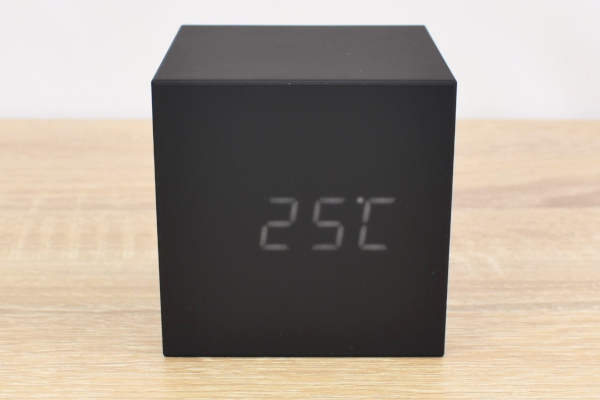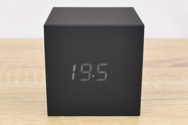 パッケージは鮮やかな赤色ですが、本体はシックなブラック。サイズは7.5(高さ)×7.5(幅)×7.5cm(奥行き)とコンパクトな立方体です。表面はゴムのような素材で、なめらかな手触り。裏側の電池ボックスに単4電池3本を入れると、電源が入り時刻が現れました。