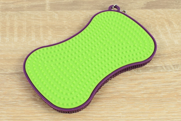 同商品は、緑色の凸凹した面と紫色のブラシで構成されているアイテム。サイズは8.2(横)×13.5(縦)×1cm(厚み)で、真ん中が凹んだ握りやすい形になっています。