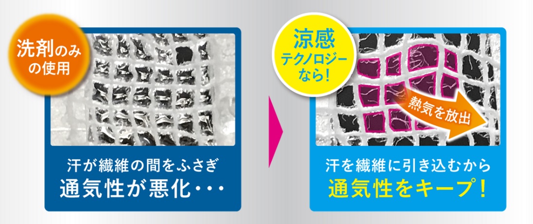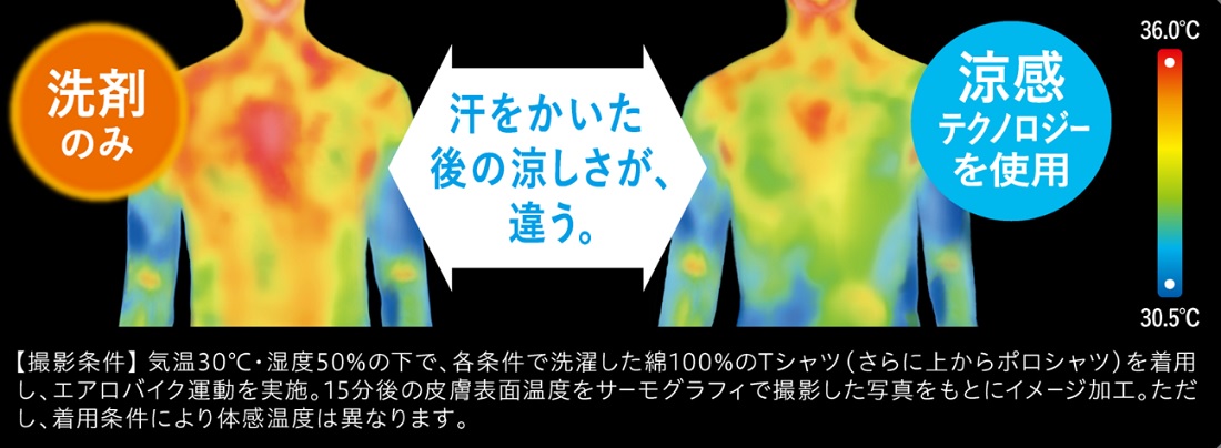 花王がこの春発売した衣料用柔軟仕上げ剤「ハミング涼感テクノロジー」は、大きく「体感湿度 MAX-10%」と書かれたパッケージデザインが目を惹きます。これは、吸水性のある成分を配合することで、繊維に汗などの水分をしっかり吸収させ、通気性を向上させることで衣服の中が蒸れにくくなる効果を狙ったもの。汗をかいても衣類の通気性を保つため、涼しく感じさせる効果もあるようです。