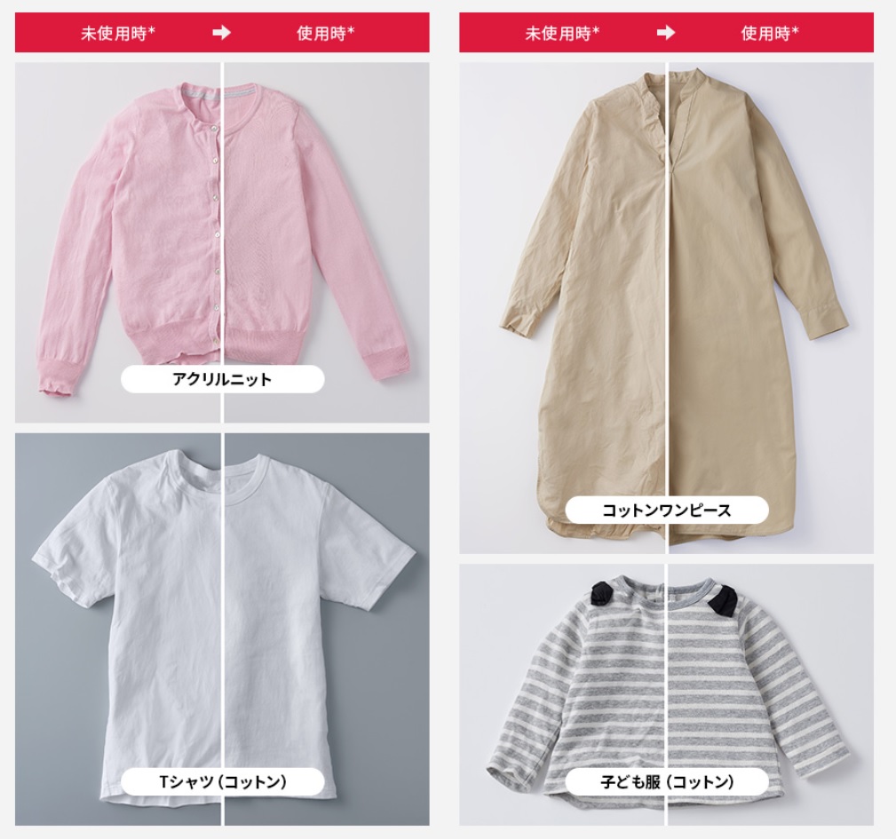 コットンのTシャツを洗ったのですが、干すときに軽く襟元を引っ張って形を整えておけば、ヨレもなくきれいに乾きました。おしゃれ着用の洗剤を使うほどでもないけど、ダメージやヨレは気になる、というような衣類を仕上げるのにピッタリだと思います。