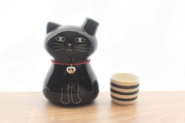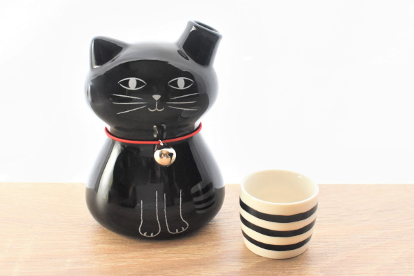 88(横)×70(奥行き)×127mm(高さ)のとっくりと、47(直径)×39mm(高さ)のおちょこがセットになった同商品。とっくりは黒ネコがちょこんと座った形をしていて、片方の耳からお酒を注げるようになっています。首輪のように巻かれている赤いゴムには本物の鈴がついており、裏返すとしっぽのイラストも。見えるところに飾っておきたくなる可愛さです。