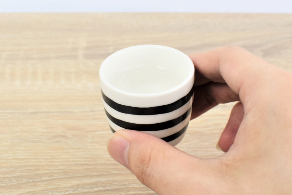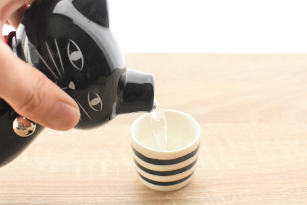 ボーダー柄のおちょこは、底の部分にネコのロゴ入り。使わないときはとっくりの耳にかけて収納できますよ。