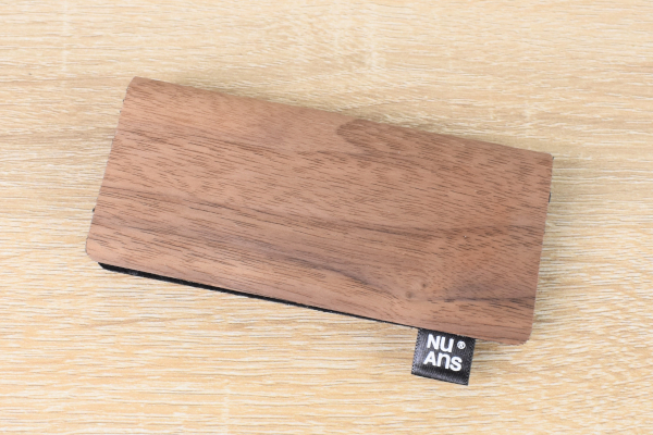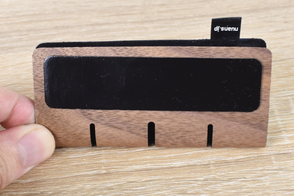 100(縦)×50(横)×10mm(厚み)とスマートフォンより小さいサイズの同商品。今回購入したのは、落ち着いたダークウッド柄のものです。