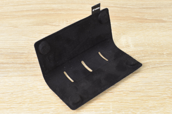 2つ折りになっていたホルダーを開くと、内側は起毛素材の柔らかい布張り。四隅はマグネットで固定する仕組みになっており、軽い力で開閉できました。