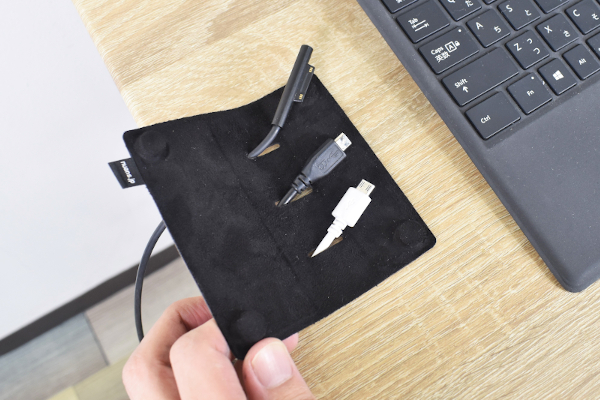 先端だけ取り出しやすい場所に固定できるので、長いケーブルをデスクの上に置かなくてもOK。使わない時はホルダーの中にすっきり収めておきましょう。
