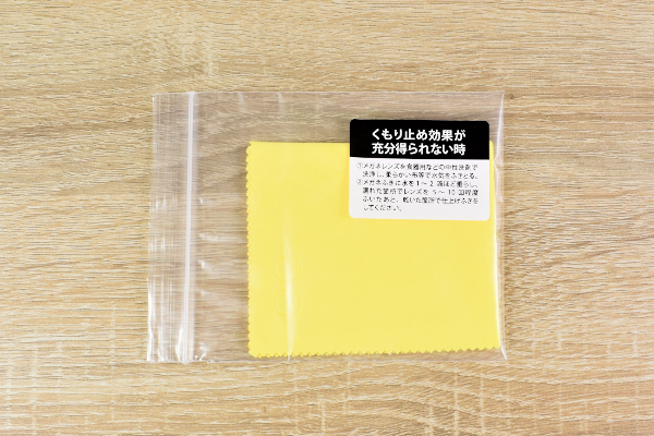同商品のサイズは約18(縦)×15cm(横)ほど。生地にはくもりを防ぐ“親水性被膜”が採用されていて、レンズの表面に水分が付着するのを防いでくれます。保管用のジッパーバッグがついているため持ち運びもラクチン。仕事場や外出先でも気軽に利用できるのがありがたいですね。それではさっそく、メガネの片方だけをふいて実力を確認してみましょう。