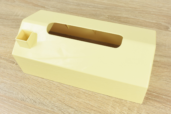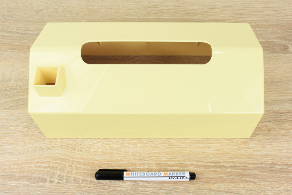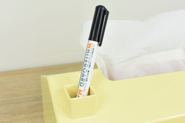 同商品のサイズは、253(横)×125(幅)×100㎜(高さ)ほど。高さ65㎜までのティッシュボックスに対応しています。カラーは淡いパステルイエローで、えんとつのついたハウス型。全ての面がホワイトボードになっており、付属のマーカーを使えばどこにでもメモが書けますよ。えんとつ部分がペンホルダーになっているので、マーカーを紛失する心配もありません。