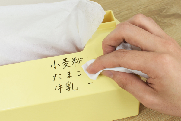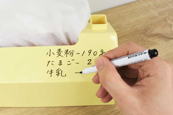 たまたまテレビで気になるレシピを紹介していたので、さっそくボックスにメモ。屋根の斜面がちょうどマーカーで書きやすい角度です。テーブルの上やテレビの前など目につくところに置けるため、家族へのメッセージを書いてもOK。消すときはイレイザーの代わりにティッシュを使いましたが、問題なくきれいに消せました。