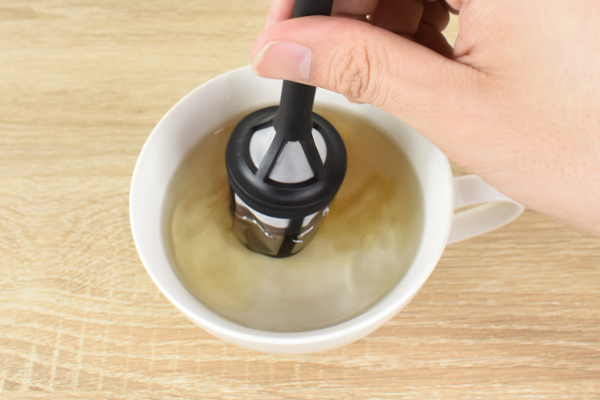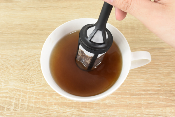 フィルターの中にコーヒー粉を入れたら、カップにセットして沸騰したお湯を注ぎます。ハンドルをひねりながら1分間かき混ぜ、あとは2~3分待てば完成。