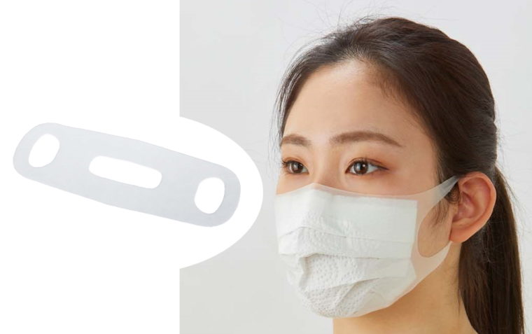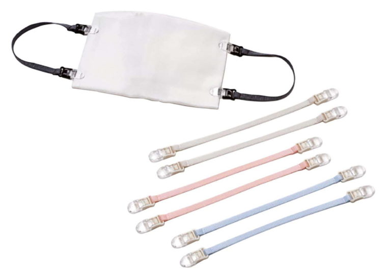 ガーゼやハンカチなどを簡易マスクに変えるストラップ。クリップはオール樹脂製で、丸みを帯びているため、肌を傷つける恐れがない。日本製のゴムひもを使用している。