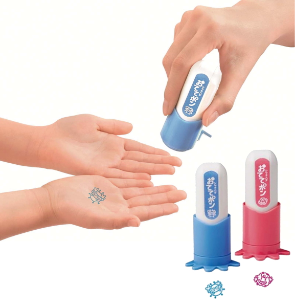 ばいきん柄のスタンプ。手のひらに捺した印影を石けんでしっかり落とすことで、楽しみながら手洗いの練習ができる。インクには安全性に配慮した食用色素を使用。