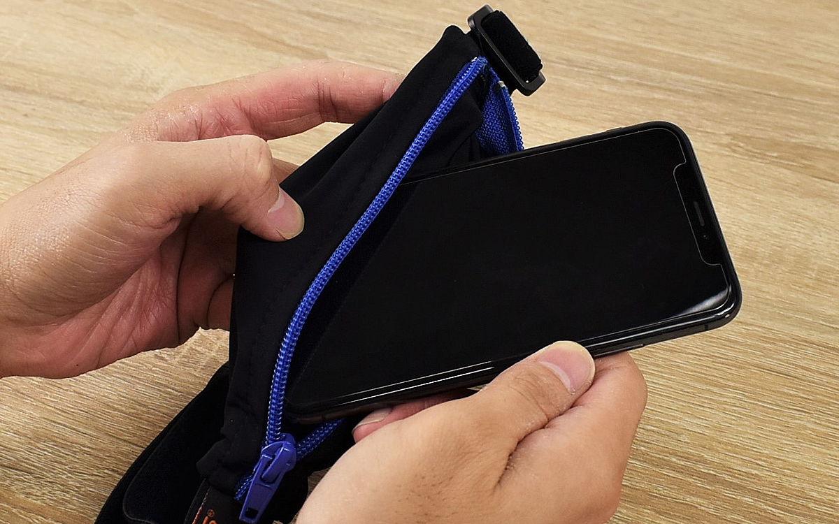 ポーチの生地には伸縮性のあるストレッチ素材が使われており、見た目以上に多くのアイテムが収納可能。試しにスマホをしまってみたところ、生地がビヨ~ンと伸びてスッポリとポケットに収まりました。それではさっそく身に着けて使い心地をチェックしてみましょう。
