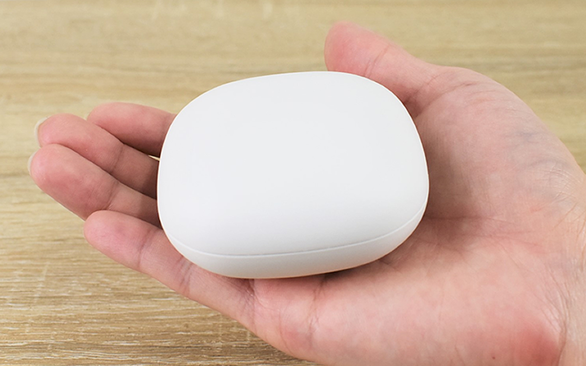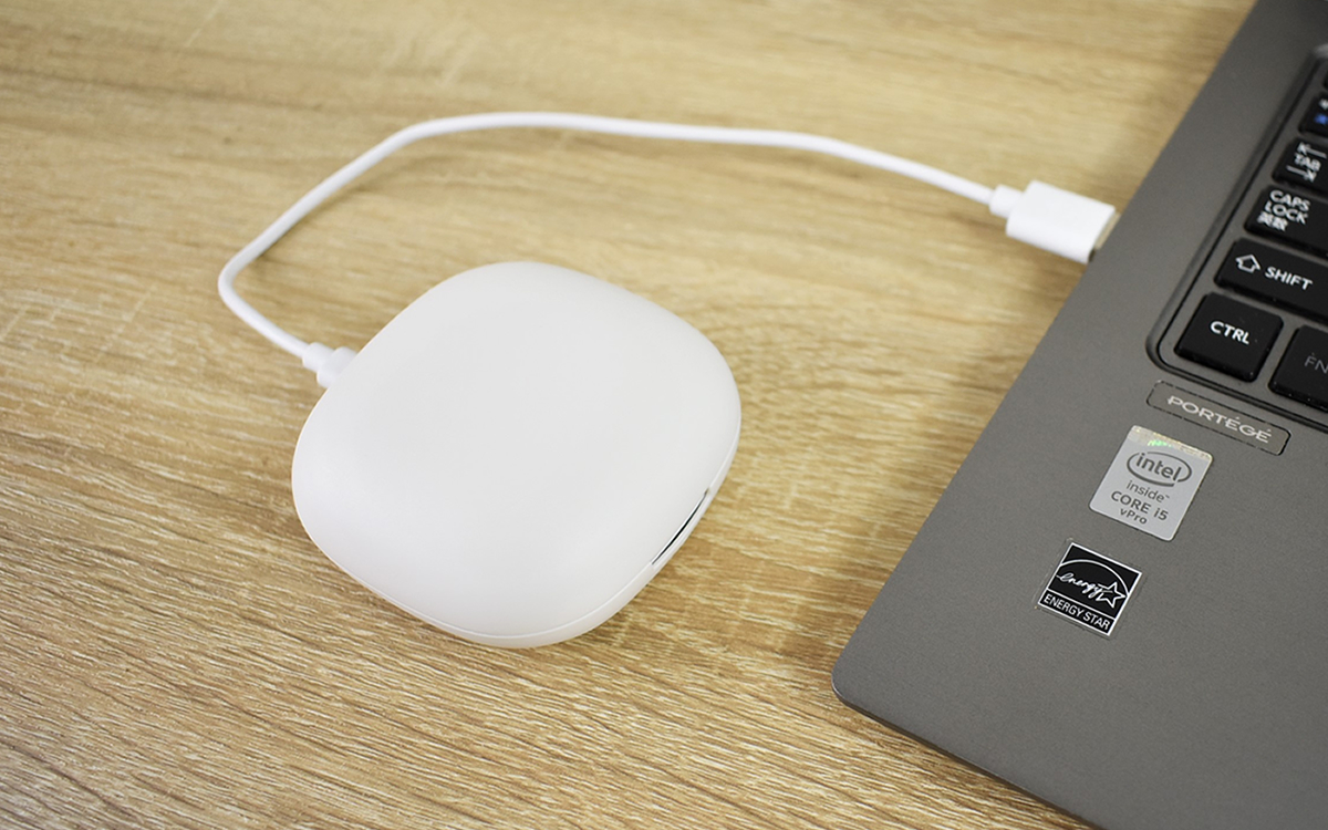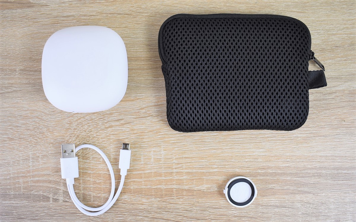 同商品は、約7.5(幅)×7.5(奥行)×3.7cm(高さ)の手のひらサイズ。黒い専用ポーチと充電用USBケーブル、そして交換用のフェルトつきホルダーがセットになっています。