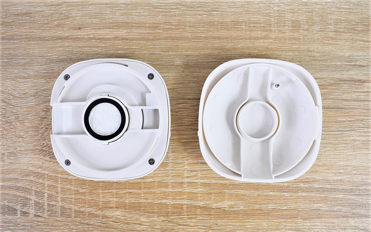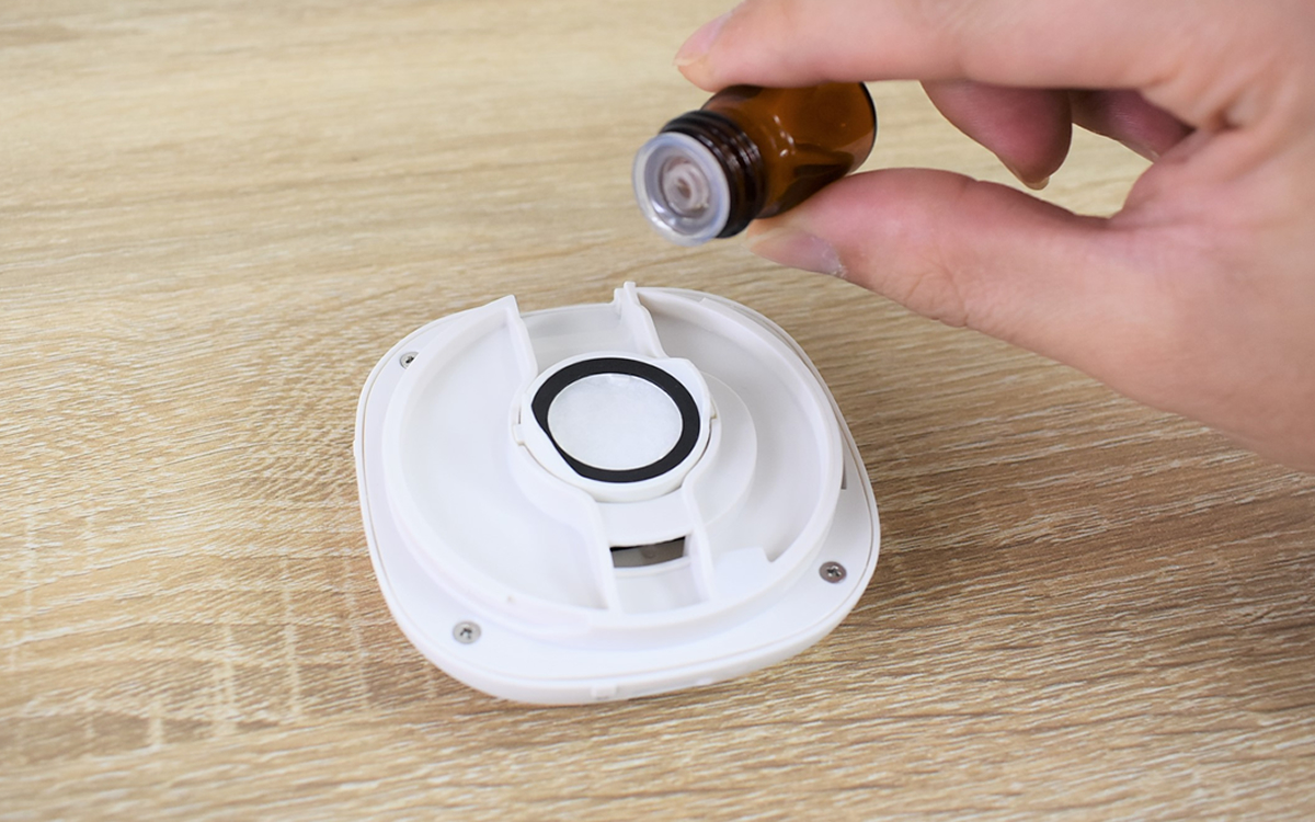 本体の上カバーを開けると、中央にエッセンシャルオイルを垂らすフェルトが。ここに好きな香りのオイルを数滴染みこませ、カバーをはめ直せばセット完了です。カバーをスライドさせて電源を入れたら、白いライトが点灯。しばらくするとオイルの香りが漂い始めました。