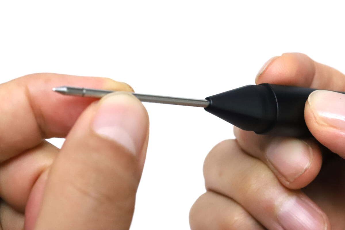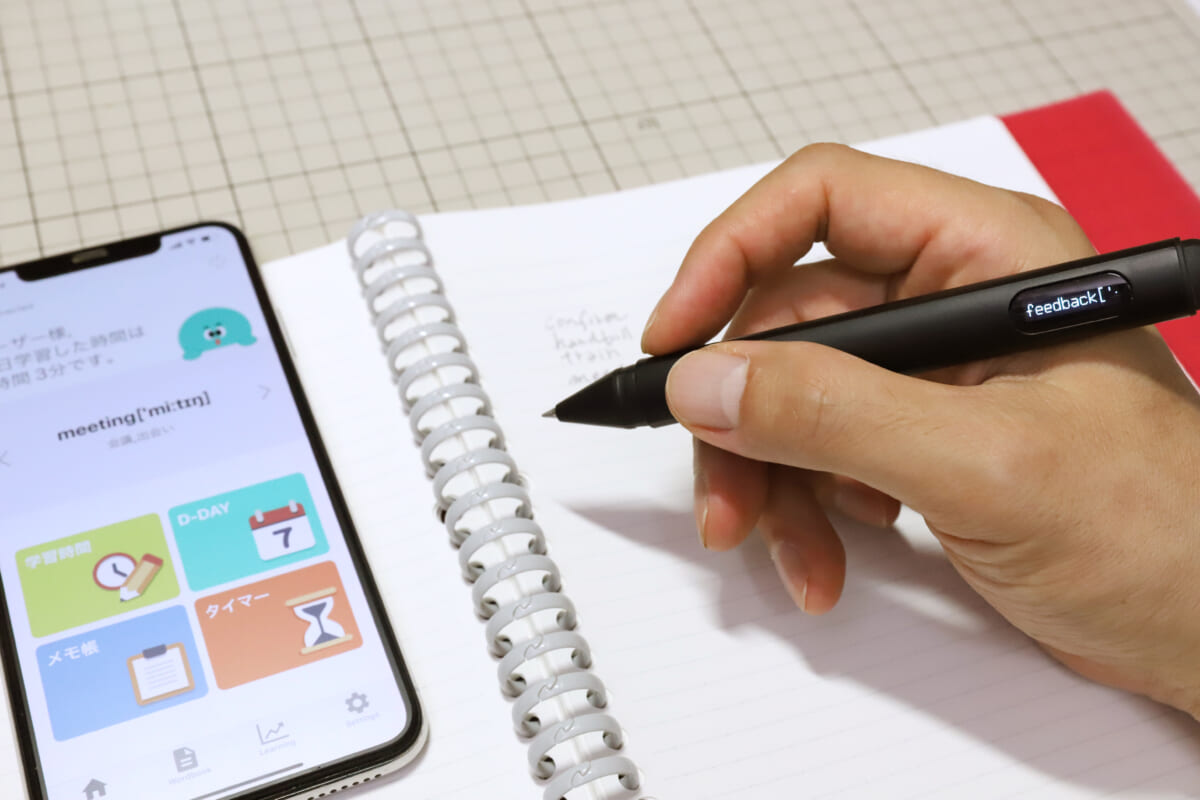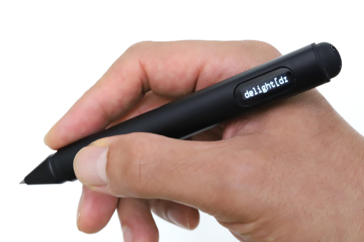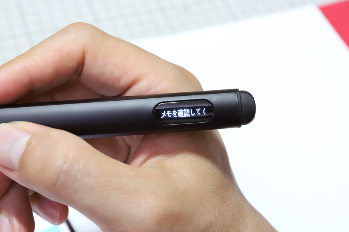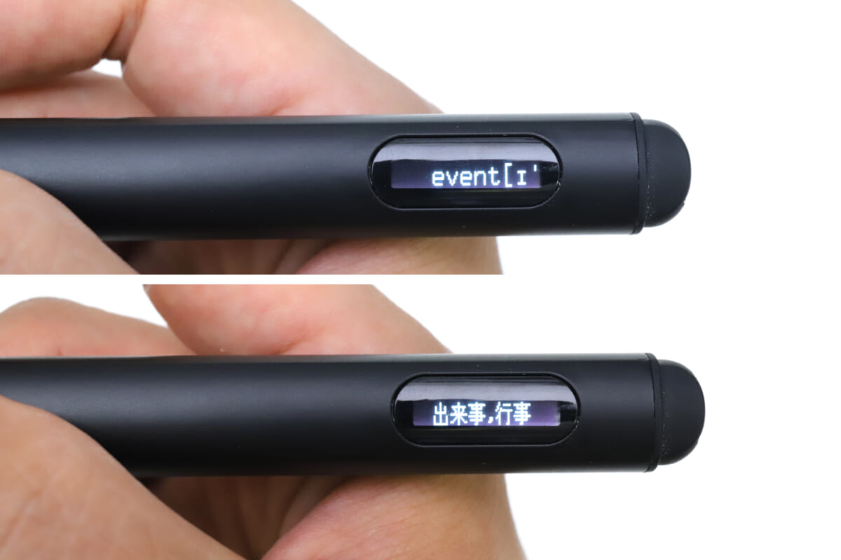 軸には小さな表示ディスプレイ(スペック表によると有機EL)を搭載し、それ以外はスイッチ類なども見えない。スマートペンとしてはかなりシンプルな構成と言える。また、外国語は、英語のほか、スペイン語・フランス語・ドイツ語・韓国語に対応、また常用漢字も収録している。