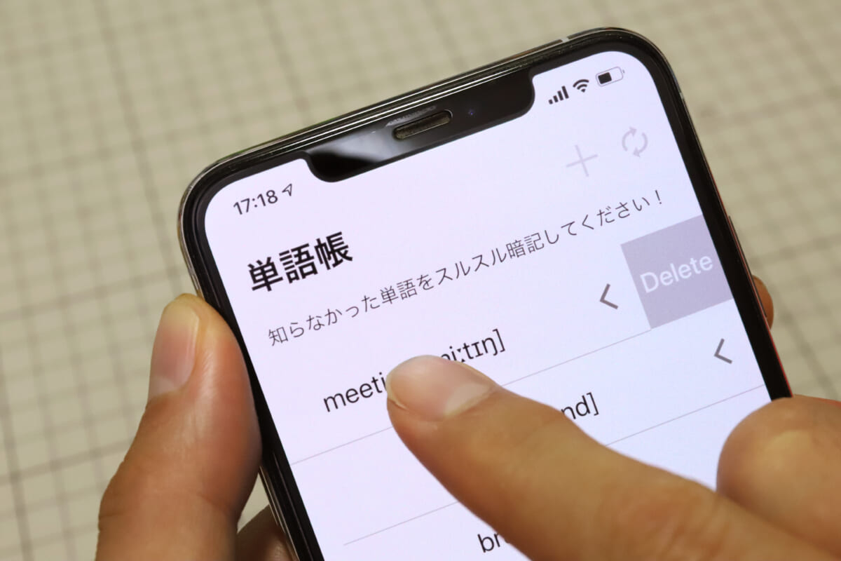 あとは人差し指で先端側から後ろに向けてフリックすると、単語がディスプレイに流れて表示される。これを書き取ることで、単語帳を見るだけよりも確実に記憶へ定着させよう、という学習メソッドだ。