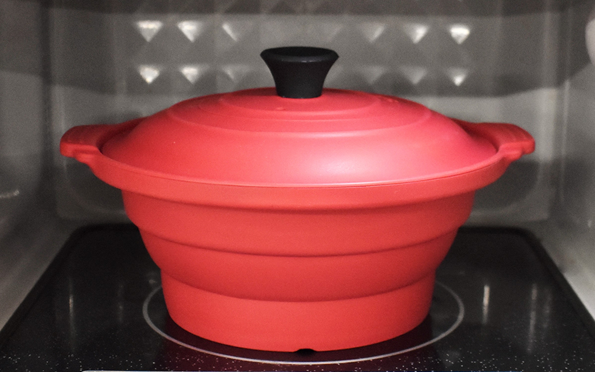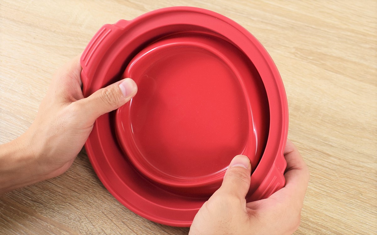 同商品はスチール製の骨組みが内蔵された鍋型のシリコンスチーマーです。容量は約1140mlと大きく、1度に2~3人分の調理が可能。鍋のフチを上から押し込むと平らに折り畳めるため、収納スペースにも困りません。さっそく使い心地をチェックしてみましょう。
