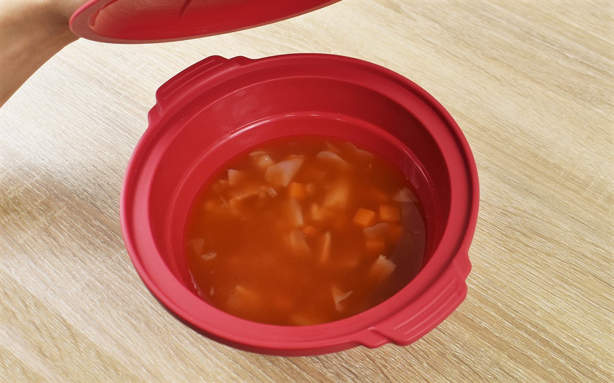 試しに野菜入りのスープを入れて電子レンジで加熱していきます。多くのシリコン製スチーマーは液体を入れると重さでたるんでしまうのですが、同商品は鍋の形状をしっかりとキープ。スープをこぼすことなく、快適に調理できました。