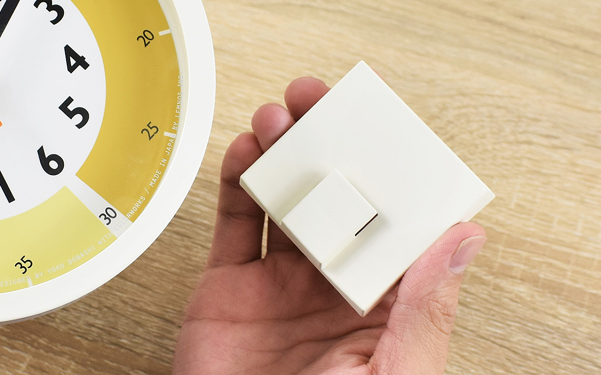 一般的な時計と同じ丸い形の本体は、150(幅)×62(奥行)×161mm(高さ)ほどの大きさ。メインの文字盤には濃い黄色と薄い黄色が、15分おきに並んでいます。15分1コマで目標設定ができるため、1時間で作業を考えるよりも明確な計画を立てられるように。なかなか上手く時間を使えない人にぴったりの商品です。