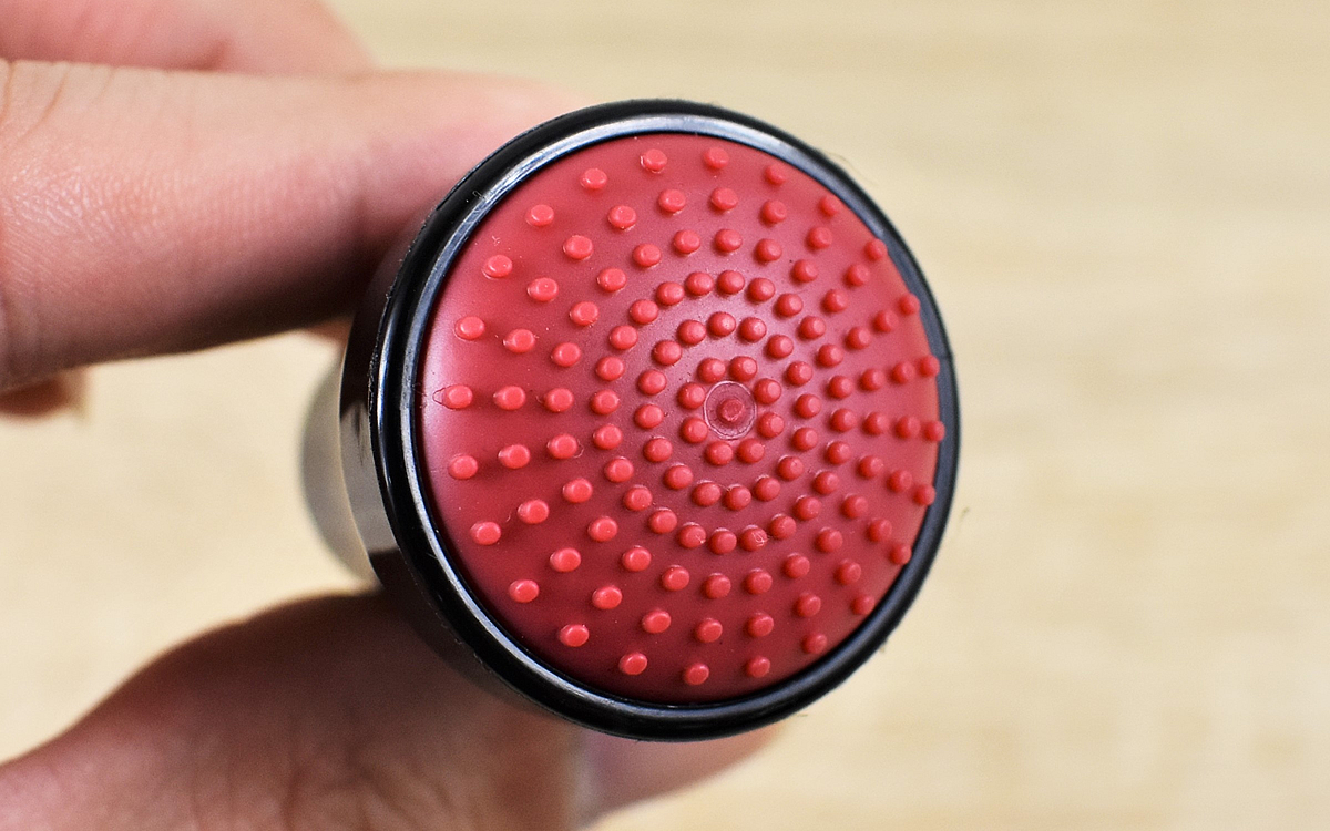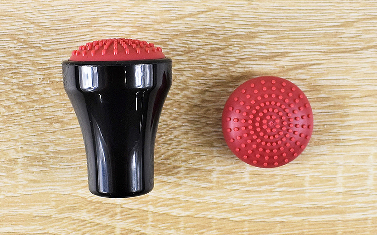 同商品は磁石の力を利用して容器の内側を洗えるアイデアグッズ。パーツは“マグネット入りの本体”と“ゴムブラシつきのスクレーパー”の2つに分かれています。本体の大きさを測ってみたところ、ブラシを含めても約30(幅)×30(奥行き)×57mm(高さ)とコンパクト。屋外でも気軽に持ち運べるのがありがたいですね。