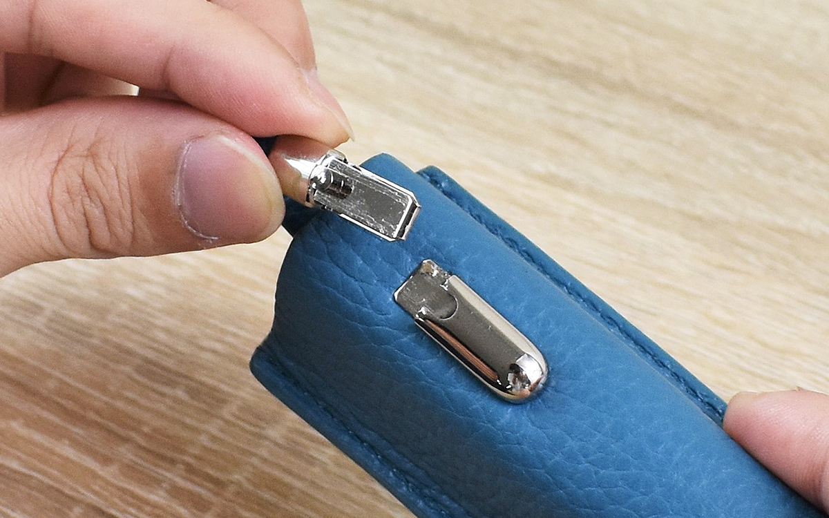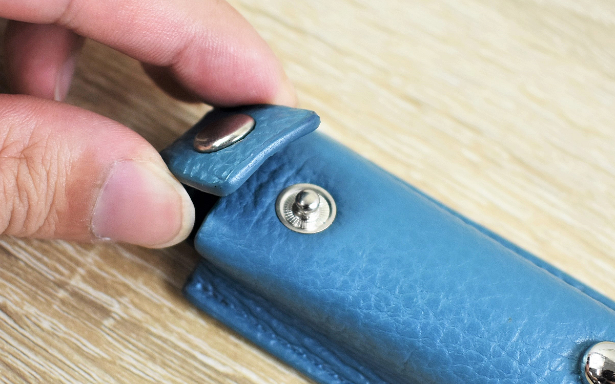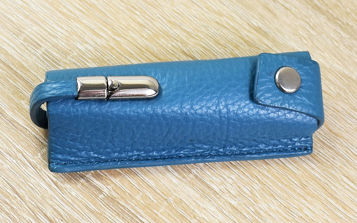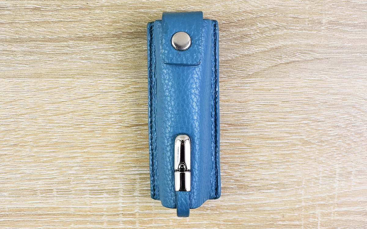 同商品は牛革を使用して作られたガムケース。大きさは約35(幅)×95(高さ)×25mm(奥行き)ほどで、粒タイプのガムなどがぴったり入るサイズ感です。ボタン留めされているホック側から取り出せるのはもちろん、本体下部にある金具を外せば下方向からもガムを出し入れできるのがポイント。機能性まで考慮されているとは… … 見た目だけと侮ってはいけませんね。