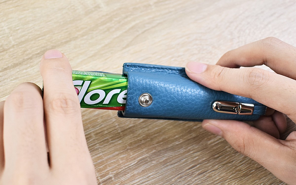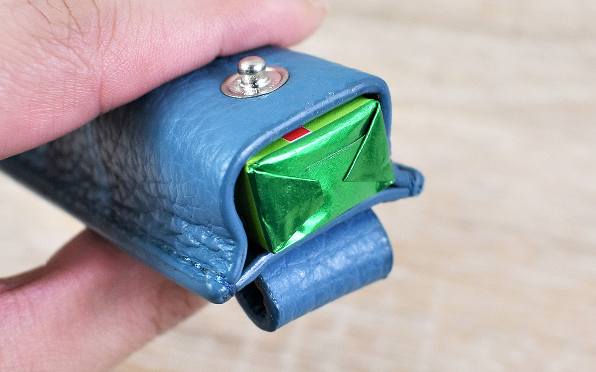 さっそくガムを収納してみたところ、ケースのサイズがジャストフィット。光沢のあるレザーに包まれて、どことなく高級感のあるガムに見えてきました。留め金の固定力が強力なおかげで、カバンの中で散らかってしまう心配もナシ。ハードルの高い牛革アイテムを気軽に利用できるため、「レザー素材のグッズに挑戦したい」という人にはかなりおススメですよ。
