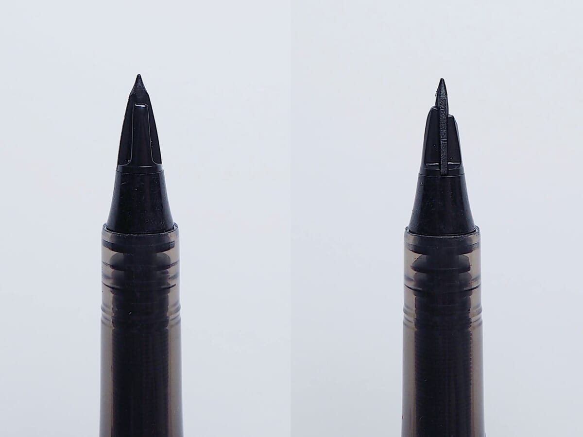 また、プラスチックの芯を、やはりプラスチックのパーツで左右から挟み込んでいるペン先は左右非対称で、筆記の方向によってしなり具合が変わるので、字には味が出るでしょう。