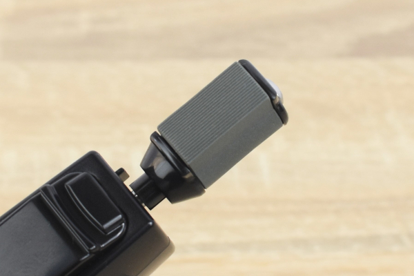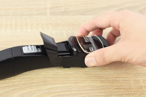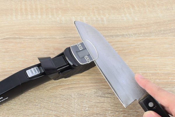 それでは家の包丁を用意し、実力をチェックしていきましょう。使い方はとても簡単で、スイッチを入れて画像のように包丁をスライドさせるだけ。“電動歯ブラシ”のような原理で中の砥石が振動するため、刃先を上下に滑らせれば自動で研いでくれます。