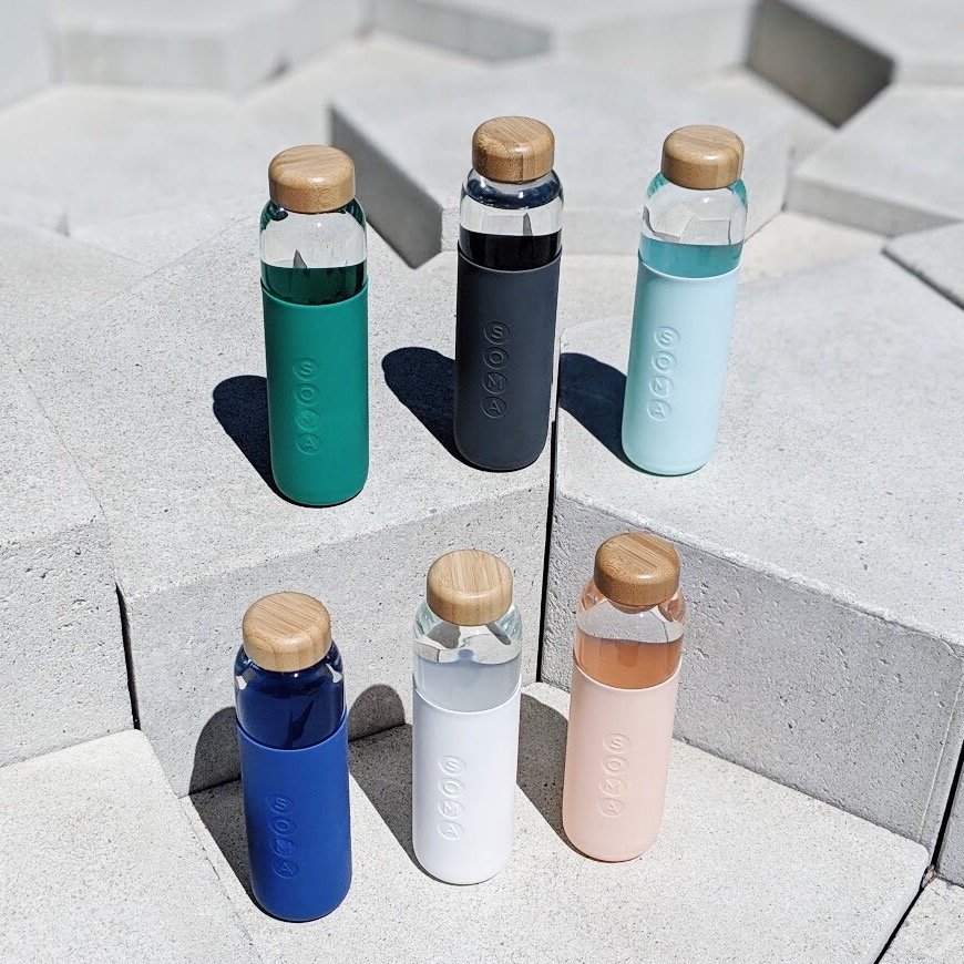 ニューヨークに拠点を置くSOMAが展開する、農薬なしで早く育つバンブーや再生素材を使用したサステナブルなウォーターボトル。匂い移りのないガラス製です。