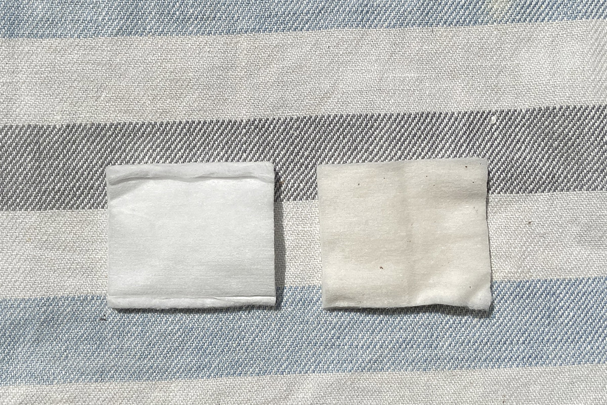 ↑綿100%の化粧用コットンで比較。左が漂白されている一般的なコットン。右が無漂白のコットン。無漂白のコットンは全体に黄みがかっており、綿花の葉や茎などのカスが混入して黒いツブのように点在しています