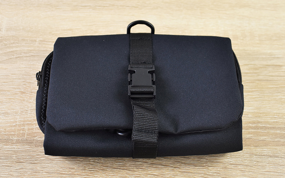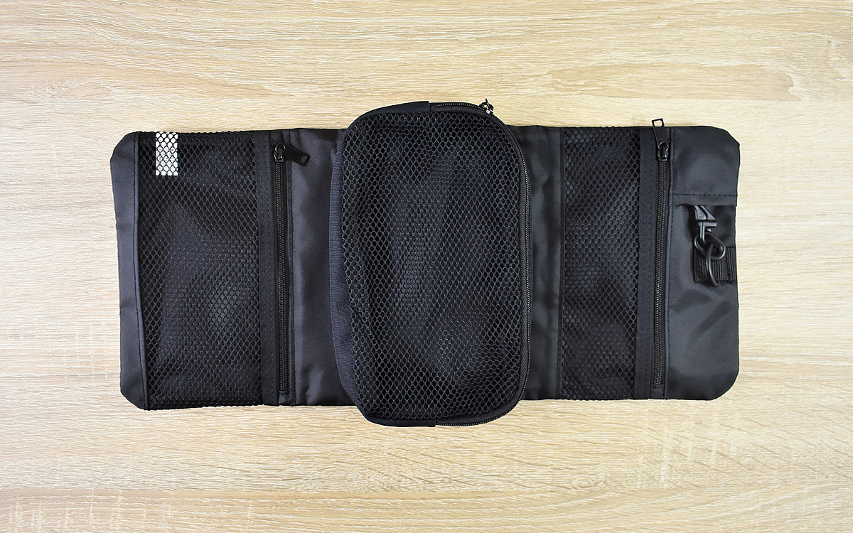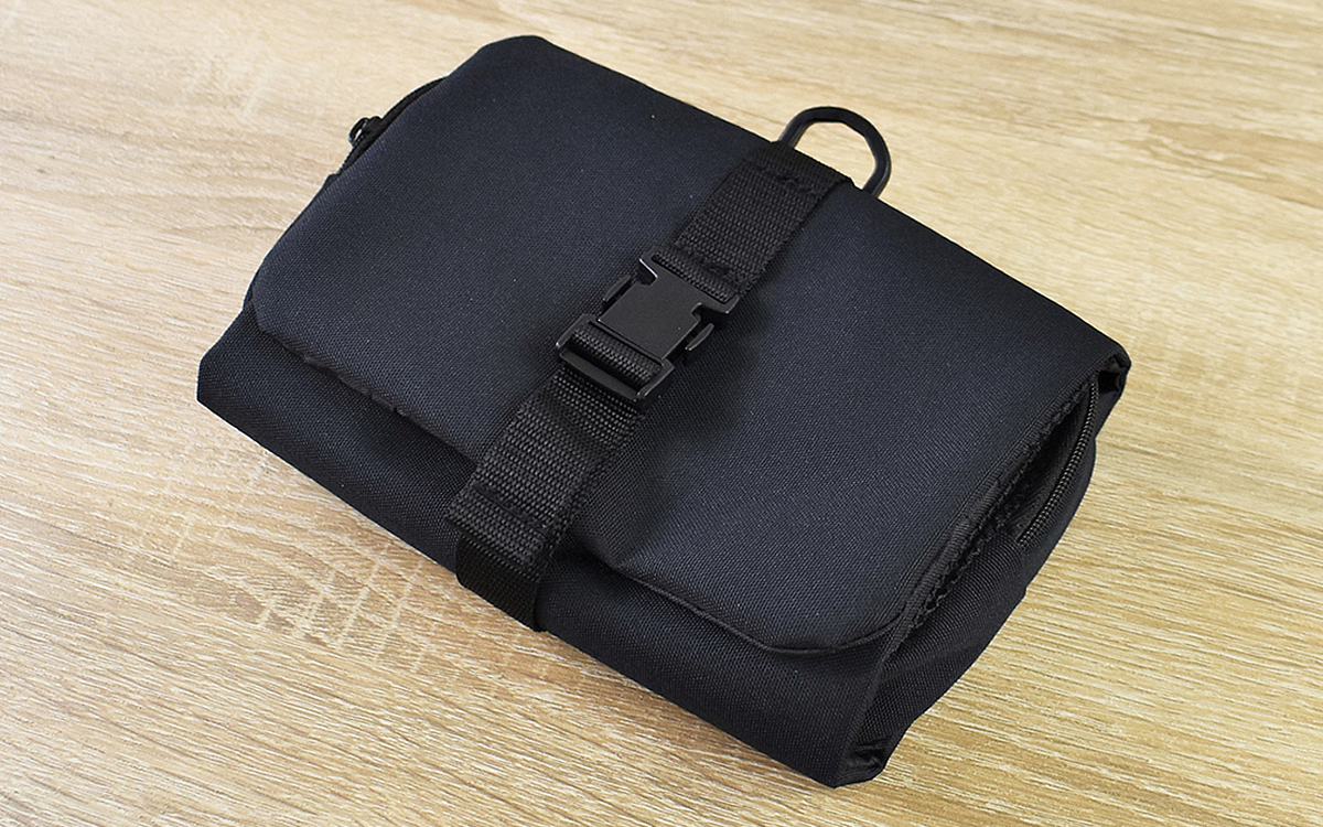 ネーミングの通り、“ポリエステル”で作られた同商品。閉じた時の大きさは約12(横)×18(縦)×4.5cm(高さ)ほどで、超コンパクトなサイズ感です。さっそくケースを広げてみると、小さなポーチとチャックがついたポケットがお目見え。小さな見た目に反して、収納するスペースはかなり広々としています。