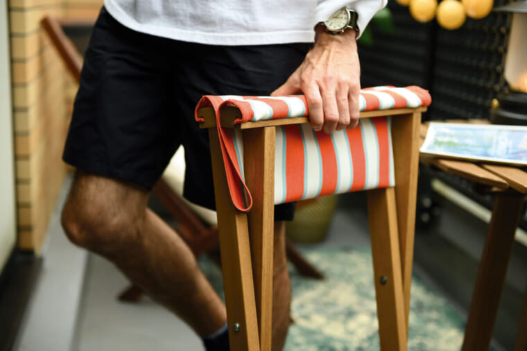 ユーカリ材で作られた折りたたみスツール。高密度で油分を多く含む材質のため、雨風や乾燥に強くカビが発生しにくい。座面には耐久性に優れた再生ポリエステル生地を使用。取り外して洗濯できる。