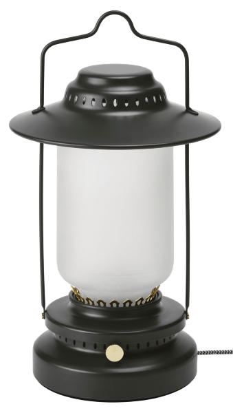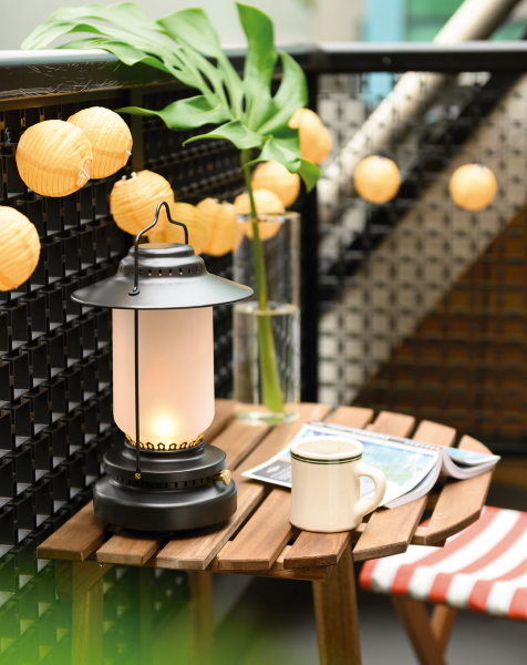 シェード部分にガラスを使い、灯油ランプを思わせる趣のLEDランタン。耐湿性と耐水性を備える。電源は、電源コードと充電池(別売り)の両方が使え、フル充電した場合約12時間点灯する。充電時間は7時間。
