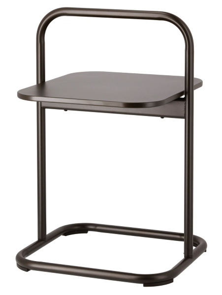 持ち手付きで移動させやすいサイドテーブル。手入れが簡単なスチール素材に粉体塗装仕上げを施しており、雨風にさらされてもサビにくい。汚れてもさっと水拭きするだけできれいになる。