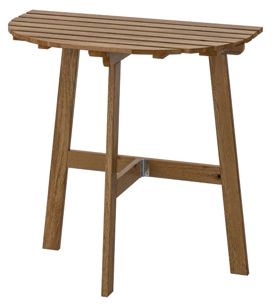 木材の自然な表情を楽しめる半透明のウッドステインを施したテーブル。直線部分を壁などに固定して使用する。半円形でスペースを圧迫しないため、狭い通路にも設置しやすい。アカシア無垢材を使用。