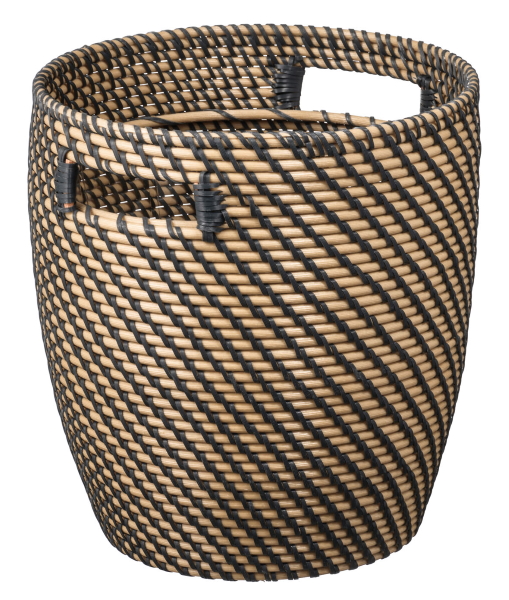 プラスチック製ながらも天然素材のような風合いで、インテリアに馴染むデザイン。内側には水漏れを防ぐプラスチック製カバーが付いている。移動に便利な取っ手付き。24cm(1999円)タイプもある。