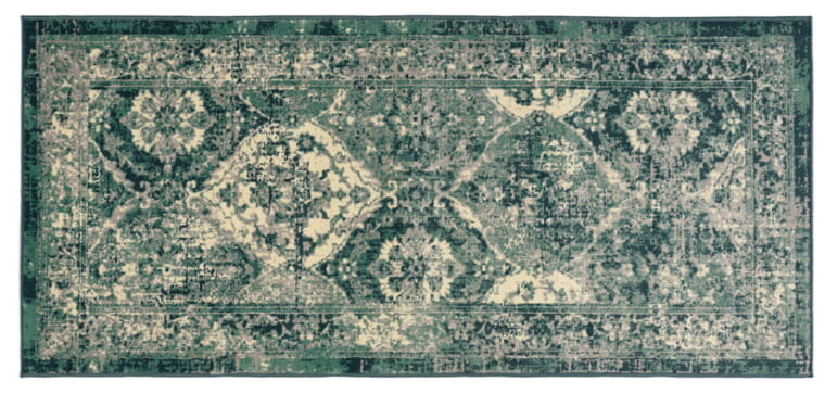 使い込んで色あせたように見える模様を施し、年代物のオリエンタルラグのような雰囲気を演出。耐久性に優れ遊び毛が出ないポリプロピレンを使っている。汚れがつきにくく手入れが簡単。80×180cm。