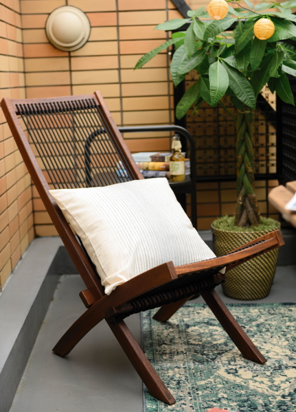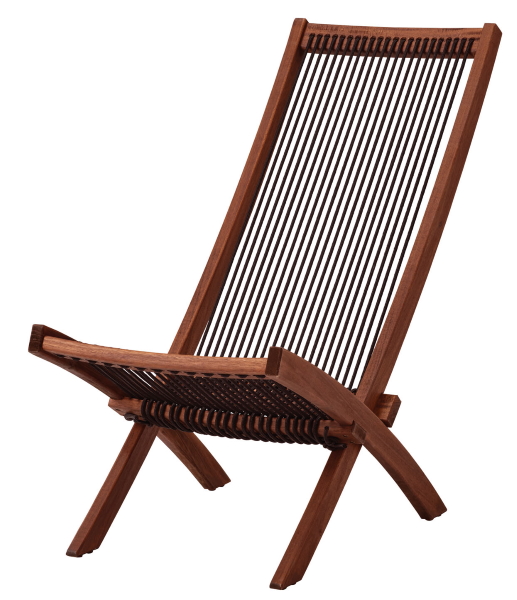 折りたためる屋外用のチェア。絶妙な角度と高めの背もたれで、くつろいで座れる。座面と背もたれがロープでできているため通気性も抜群。脚には滑り止め付き。