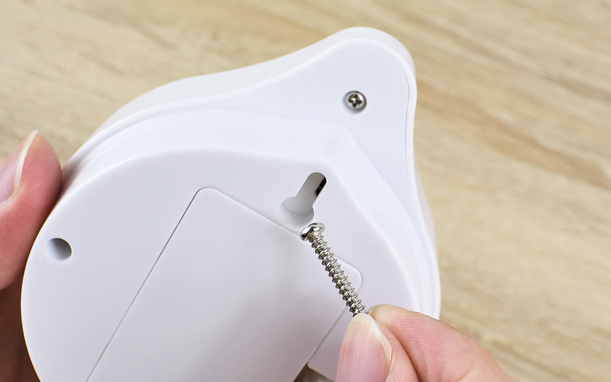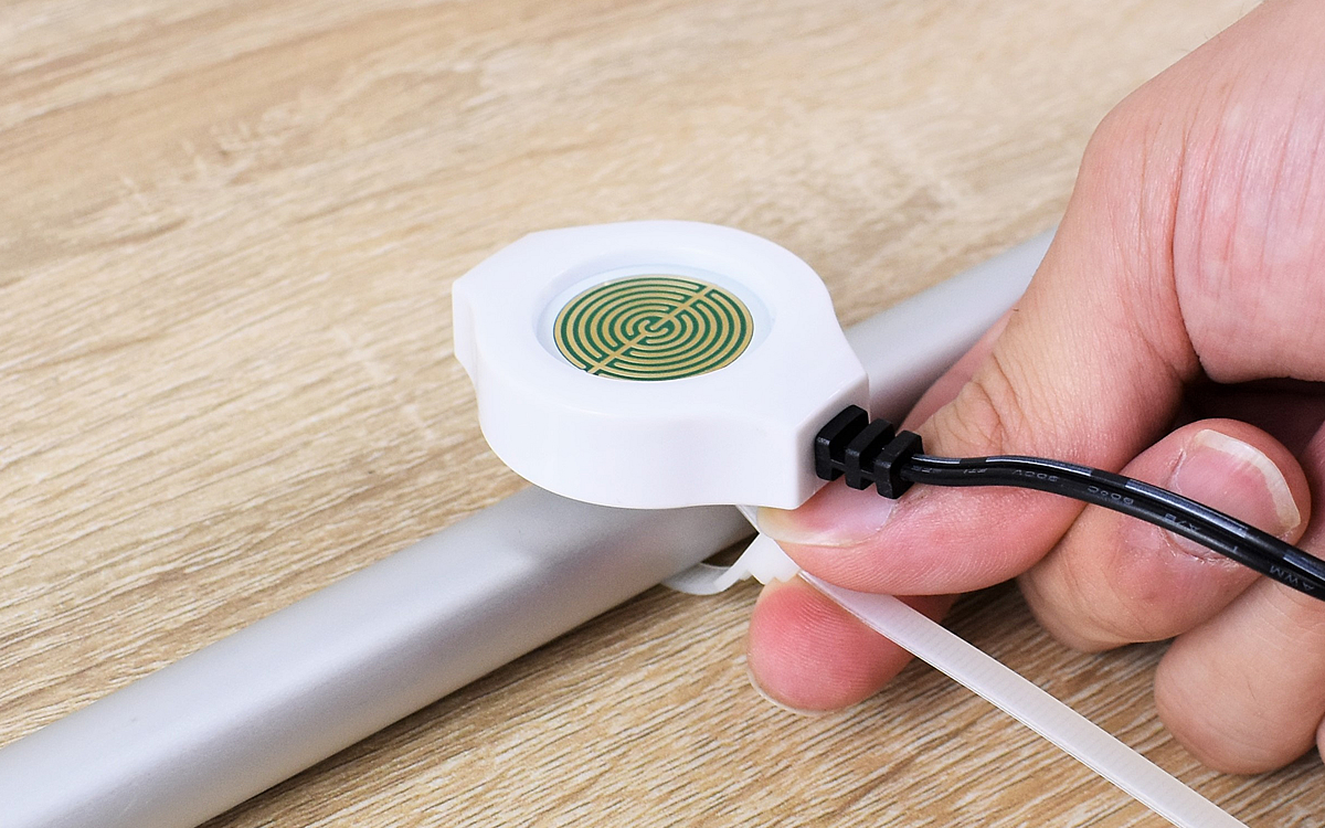 大きさ8.5(幅)×12(奥行)×3.7cm(高さ)ほどの白くて丸い本体に、約4.0(幅)×4.8(奥行)×2.0cm(高さ)のセンサーがついた同商品。センサー部分をベランダの柵や物干し竿にセットしたら、本体は家の中に設置してください。
