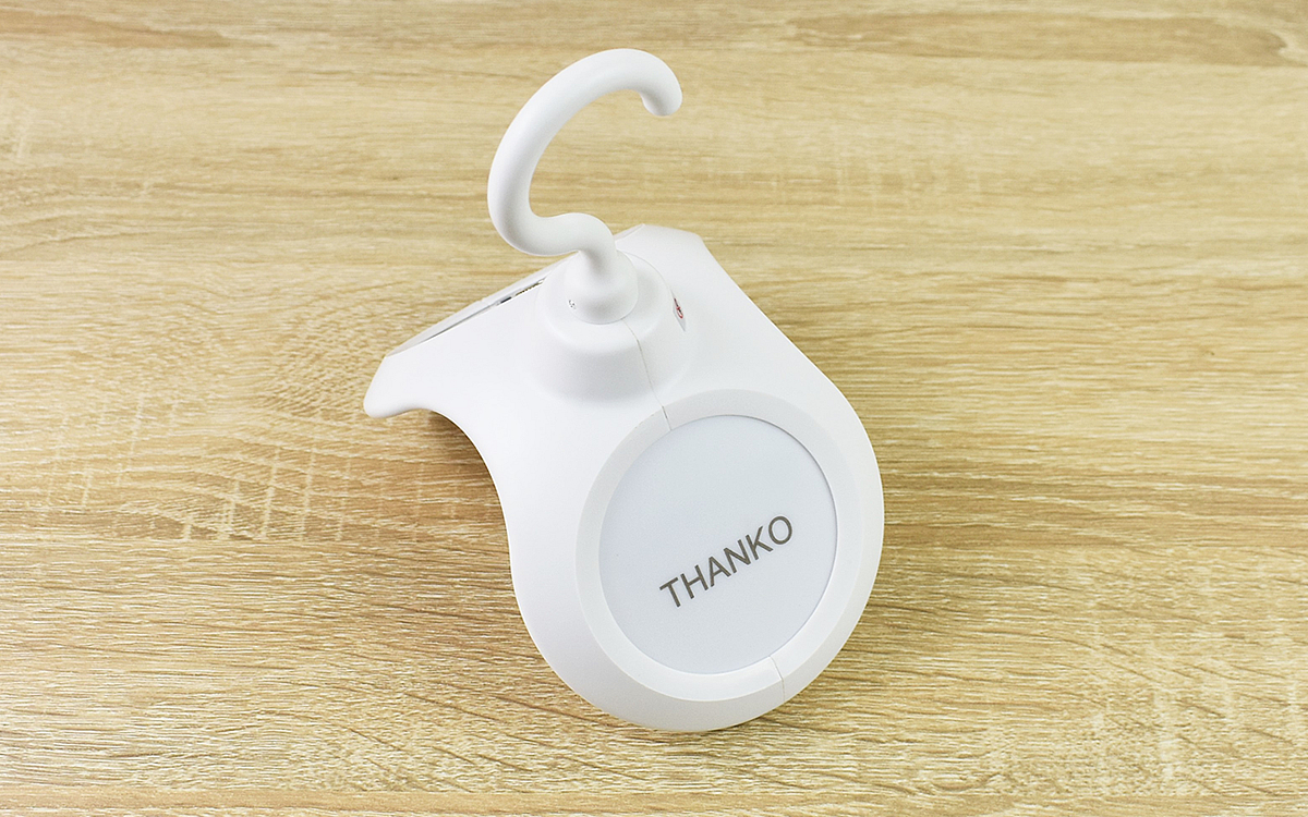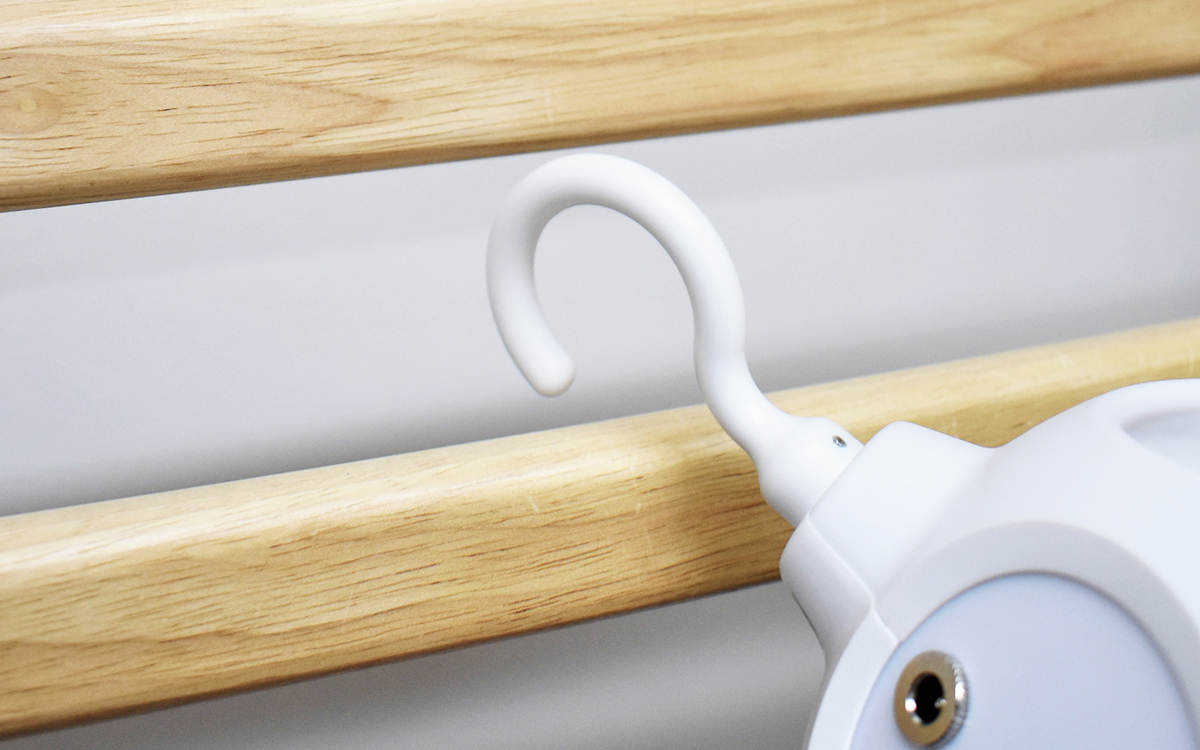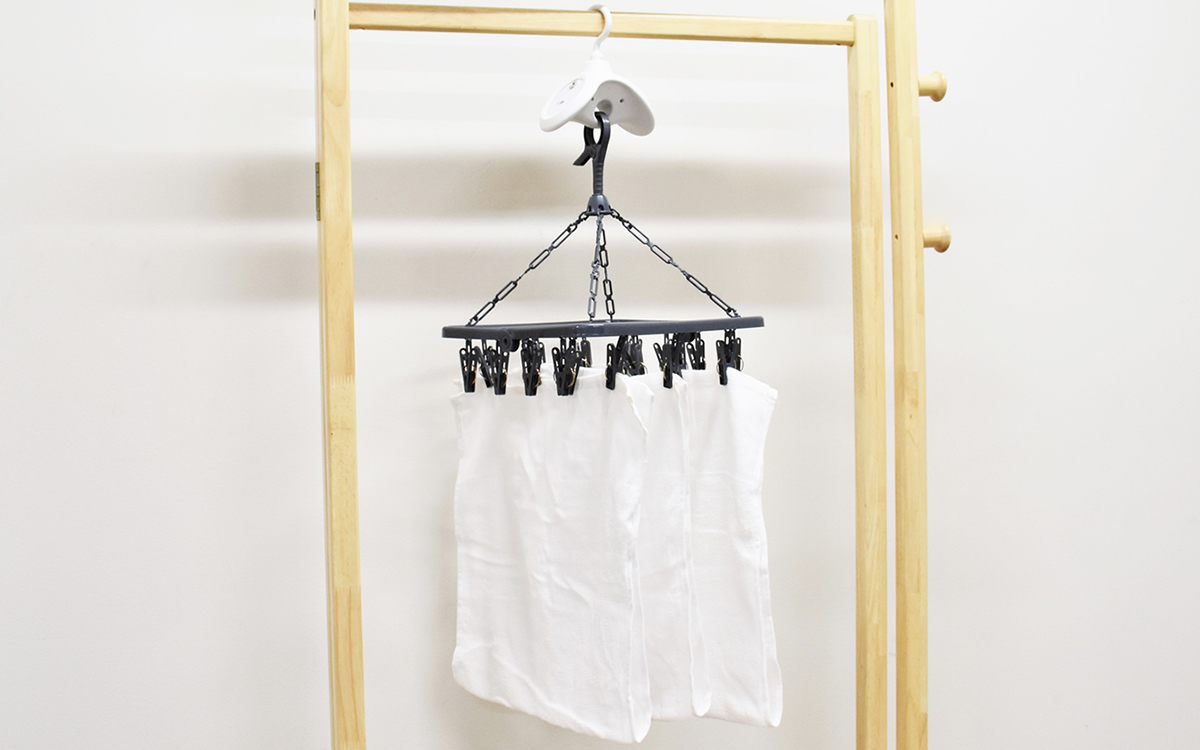 大きさ約140(横幅)×160(高さ)×100mm(奥行)ほどの同商品。本体の下部には内径およそ20mmくらいの穴があり、そこに洗濯物を干したハンガーを引っ掛けることができます。耐荷重は約5kgと頑丈なので、靴下や下着などを複数吊るしたハンガーにも安心して使用してください。
