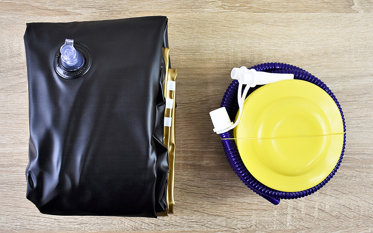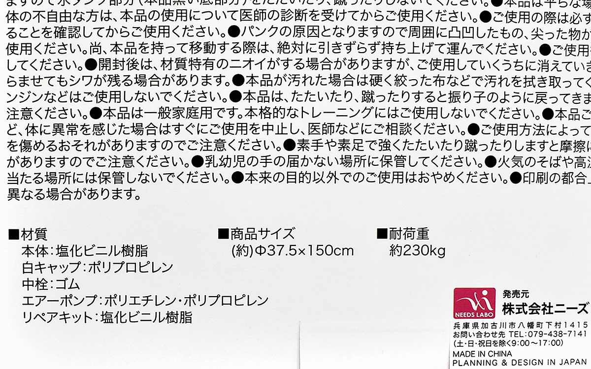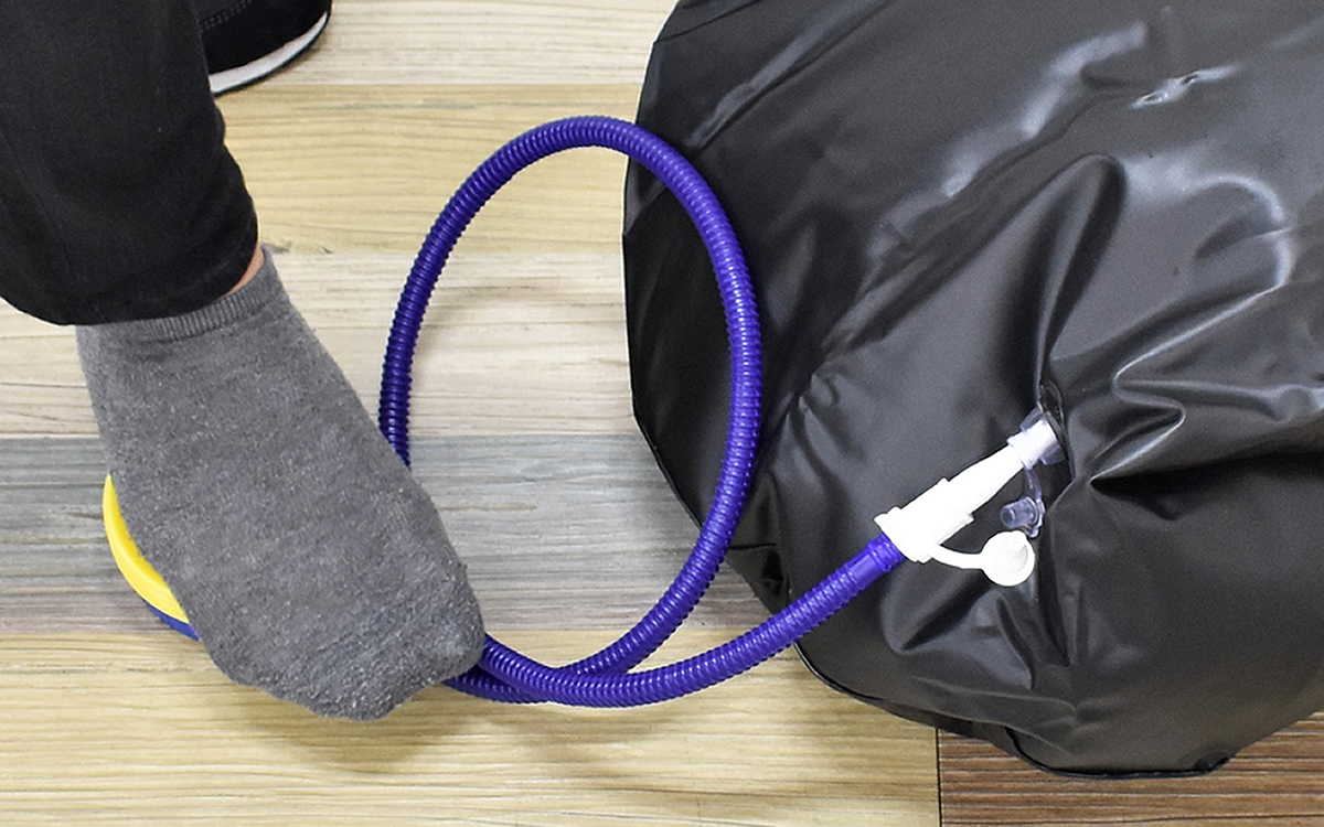 パッケージを開けると本体に加え、エアーポンプが付属。ポンプを踏むだけで簡単に膨らませられるので、肺活量が不安でも安心してください。空気を入れたパンチバッグはおよそ37.5(直径)×150cm(高さ)ほどの大きさ。思っていたよりも細長く、あまり家が広くない人にもおススメですよ。