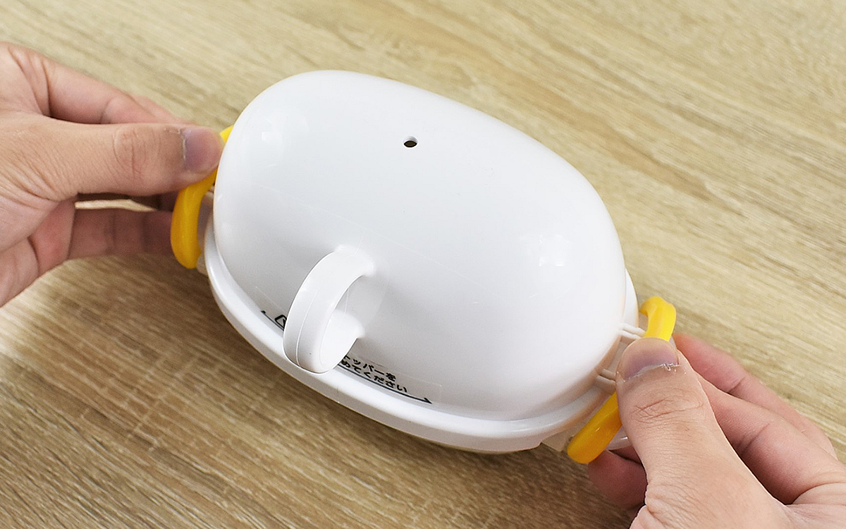 同商品の大きさは168(幅)×102(奥行)×107mm(高さ)ほどで、卵のように丸みを帯びたフォルムがかわいらしいデザイン。フタを開けると、中に生卵を2個セットできるくぼみがあります。