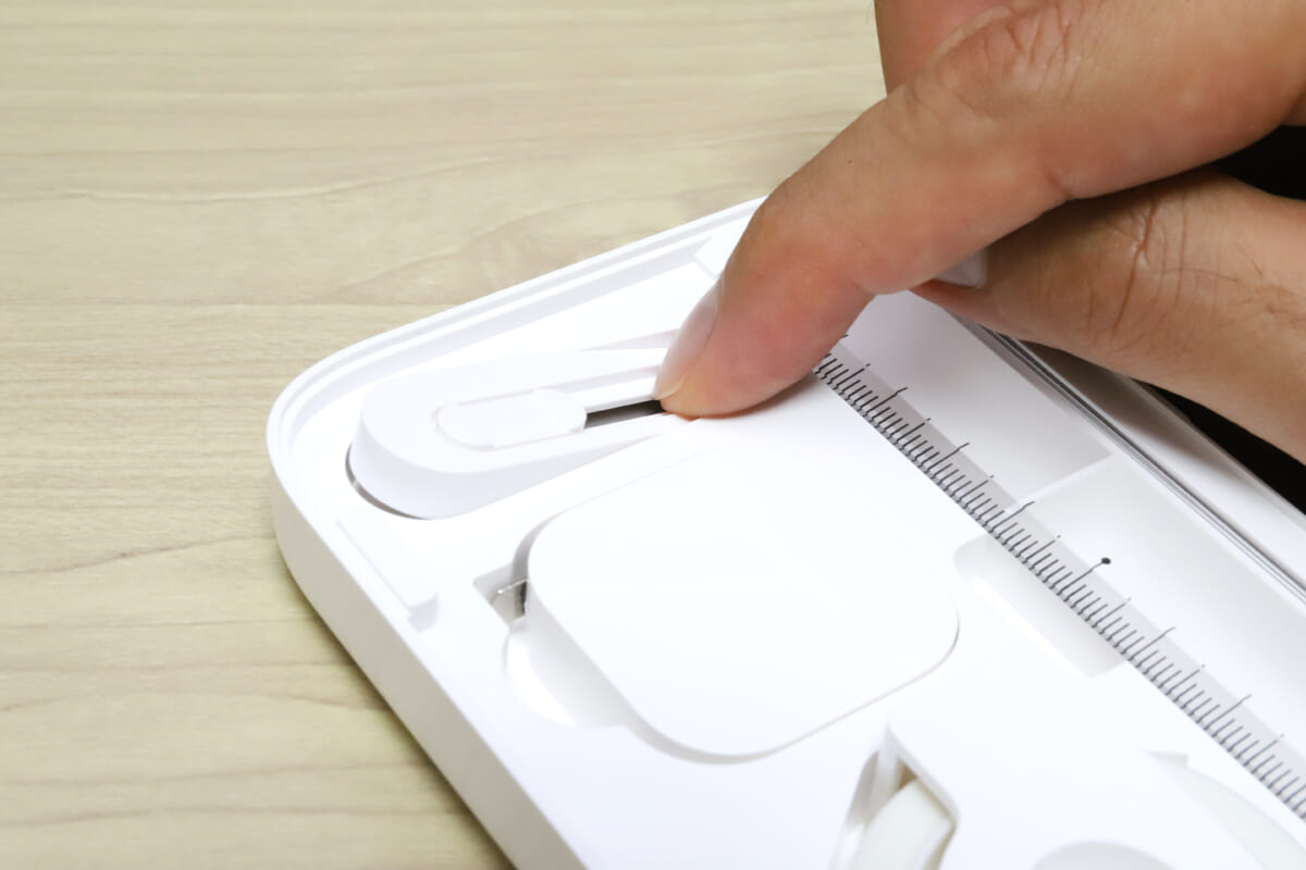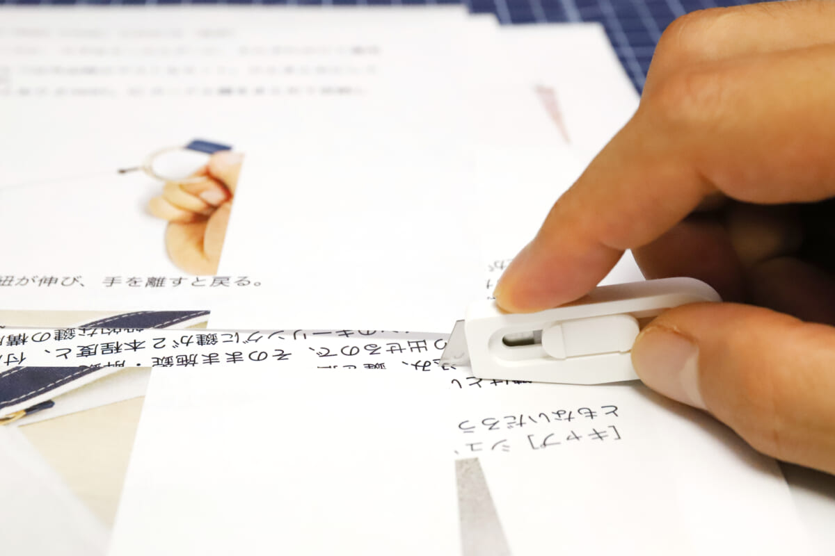 また、刃は全面フッ素コートされているので、テープなどの粘着がベタつきにくい&錆びにくくて長持ちするのもありがたい。さらには、刃を1クリックだけ出した状態で、ボディ底部の傾斜を紙面に当てながら切ると1枚切りとして使える、という小ワザも初代から継承している。