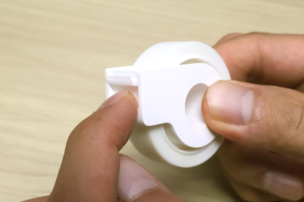 メンディングテープカッターは、刃の下を指で押し込むとテープ端がピョコっと浮き上がるようになっている。新たにテープを切るときにカッター部に触れなくていいのは安全だし、なによりテープ端が浮くアクションが、地味にかわいい。
