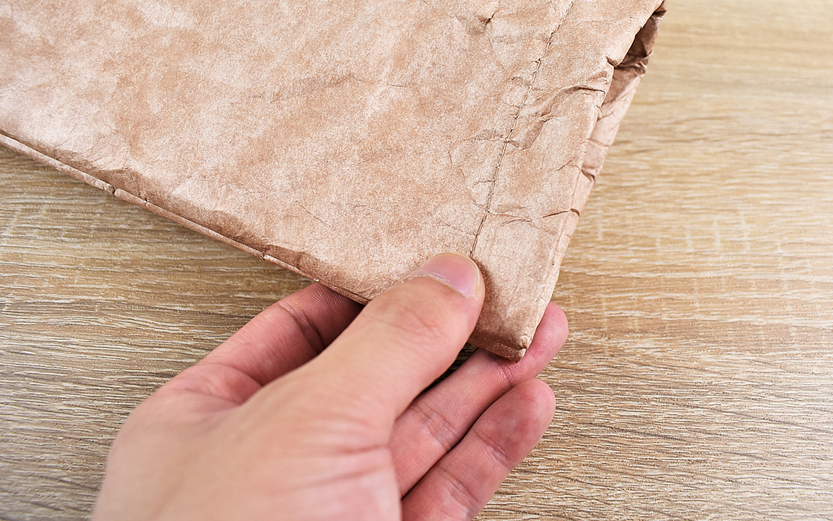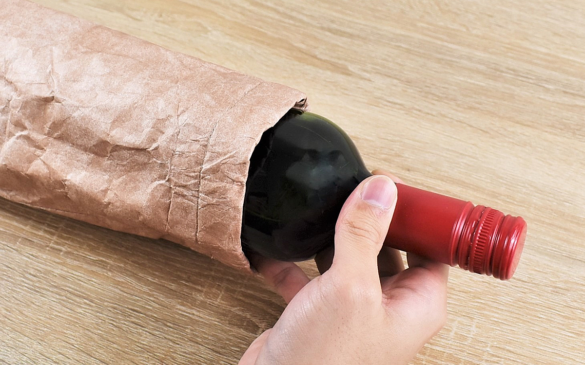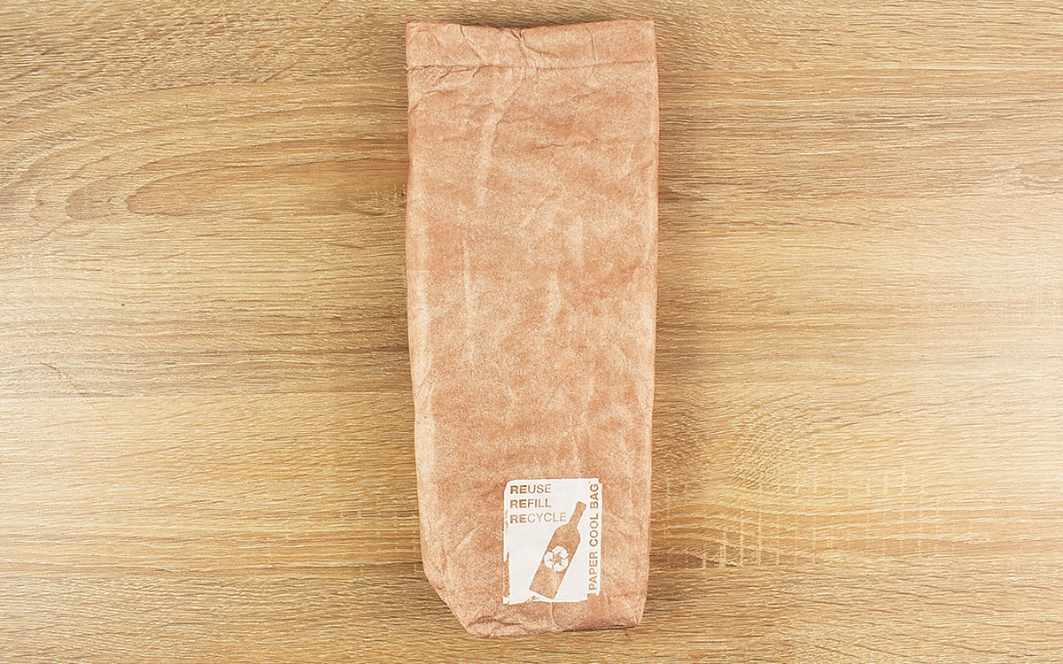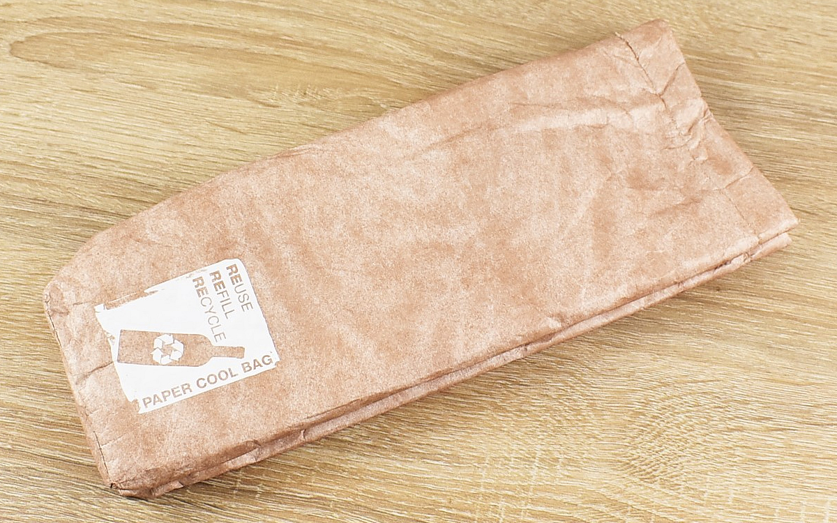 大きさは約80(幅)×75(奥行)×290mm(高さ)ほどで、ボトルの先端まですっぽり収まるサイズ感。表面はクラフト紙のような質感ですが、簡単には破れない特殊な素材が使われています。