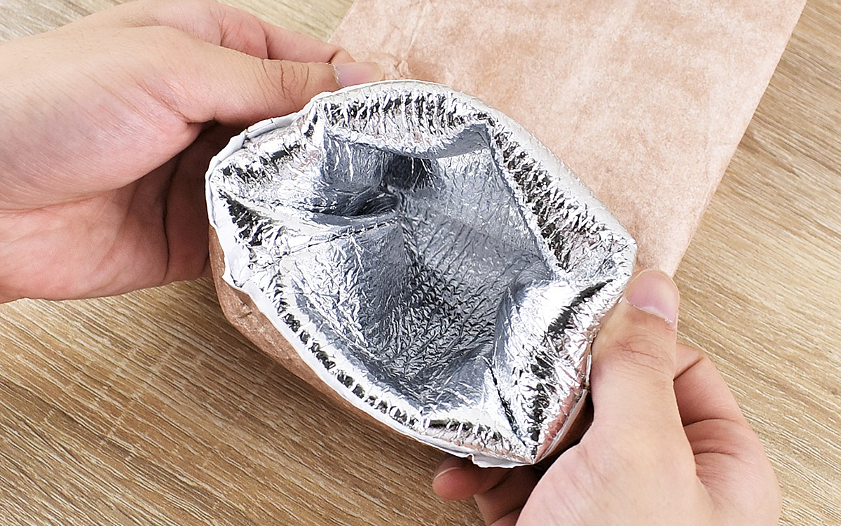内側には銀の裏地が重ねられていて、冷たさを逃さない仕組みに。ボトルを入れたら口の部分のワイヤーをしぼり、包み込むように口を閉じてください。丁寧に包むよりも、ラフにくしゃっとさせるとより雰囲気がアップしますよ。