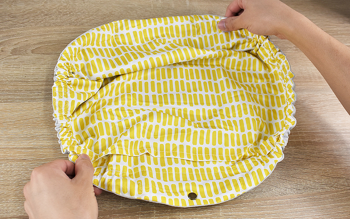 お弁当を入れる際は、取っ手付近のスリットから中にお弁当を入れるだけ。あとは両サイドの取っ手を引っ張り、バッグの形にすればOKです。着脱可能な底板もついているため、持ち運ぶ際に傾く心配がありません。