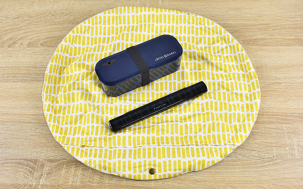 円形の布に取っ手がついており、巾着のようにお弁当を包むことができる同商品。広げた時のサイズは約46(縦)×41cm(横)ほどで、幅広い大きさのお弁当箱に対応しています。