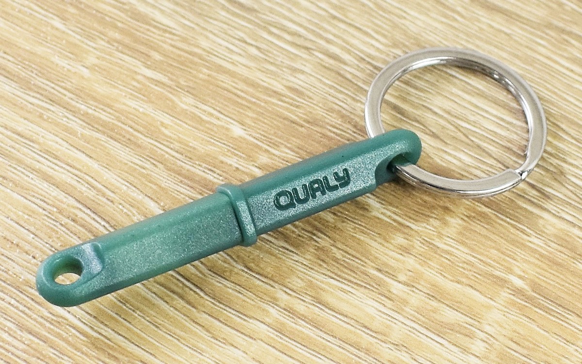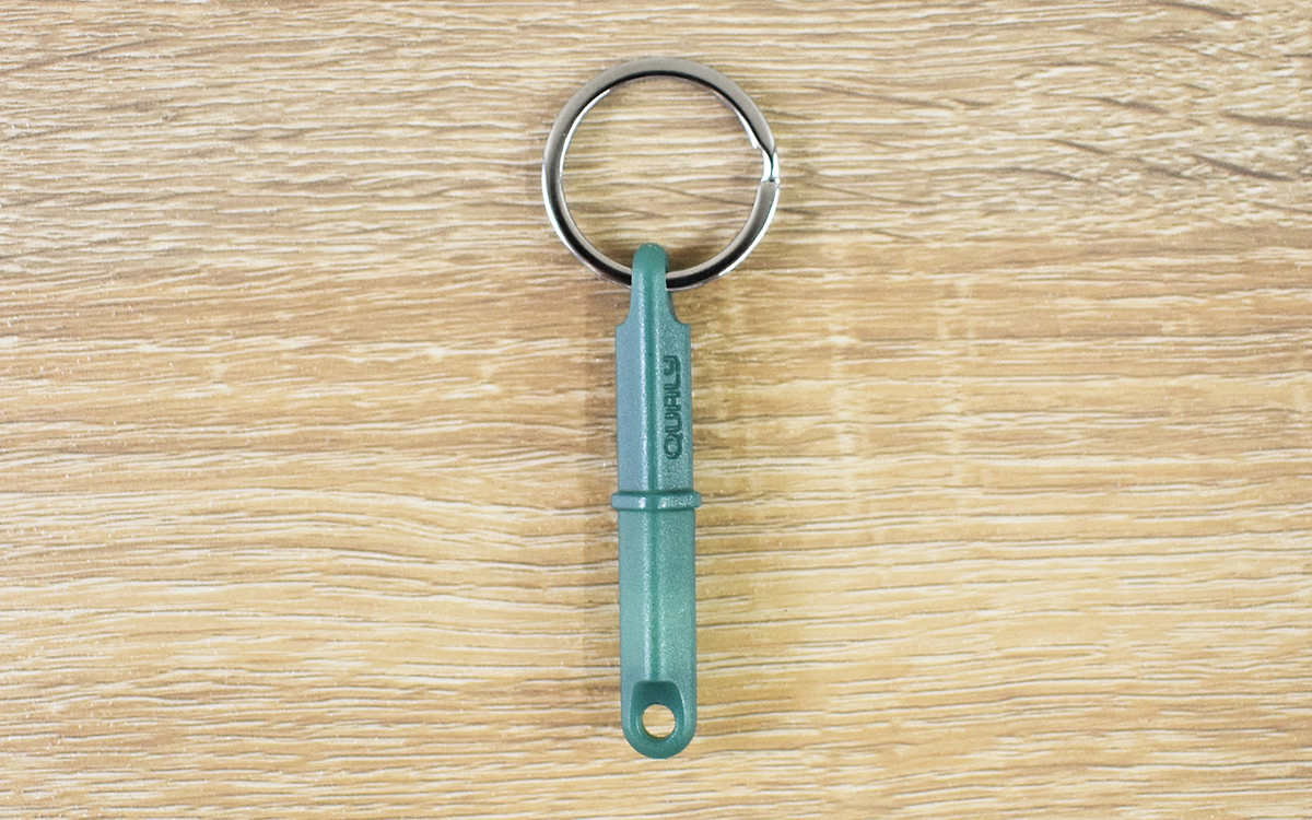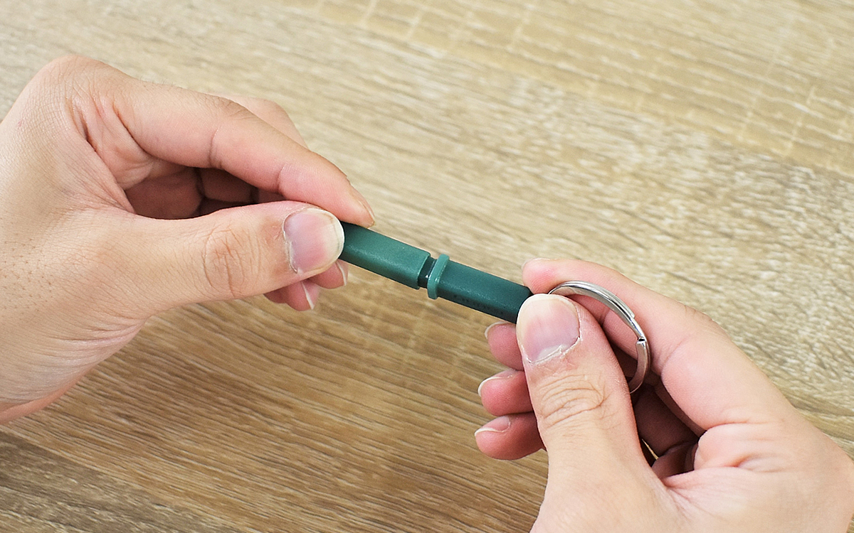 同商品は、全長88mmほどの小さなスティック。下半分のキャップを外すと突起がついており、この部分でボタンやスイッチを押せます。持ち運びに便利な大きめのキーリングつきで、バッグやネックストラップにつなげることが可能。取り出しやすい場所に携帯しておけば、いざというときに安心ですね。